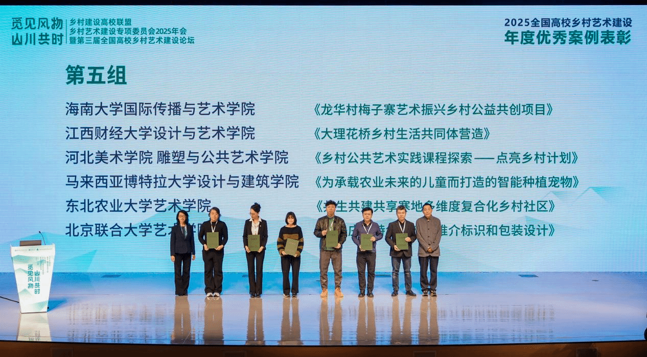 bwin必赢“海岛艺术创新研究”团队作品《龙华村梅子寨艺术振兴乡村公益共创项目》从来自60余所高校的近300件参展作品中脱颖而出,荣获“2025全国高校乡村艺术建设年度优秀案例”。该团队由包格日乐吐教授领衔,张春梅、王莉、志勇、束博等师生共同参与组建。