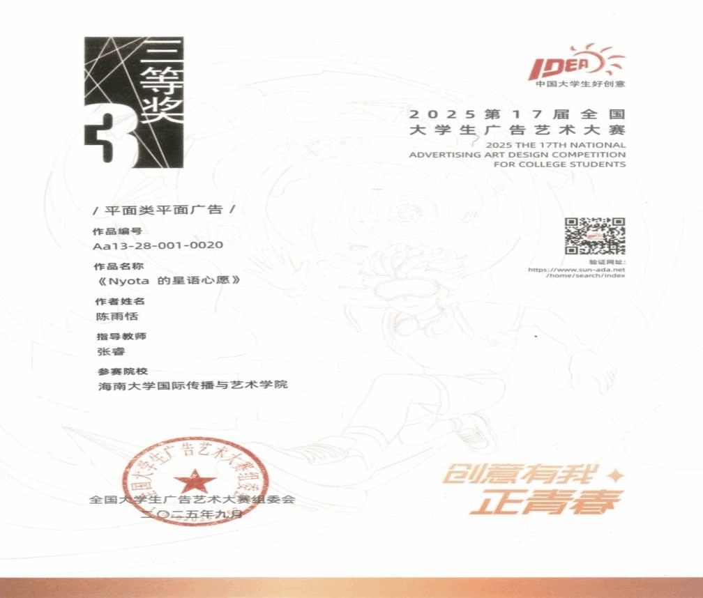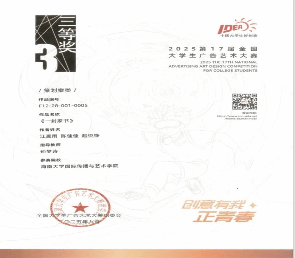 在本届大赛中,bwin必赢师生团队积极备赛、踊跃参赛,凭借扎实的专业功底与蓬勃的创造力,历经层层选拔与激烈角逐,斩获佳绩。其中,全国级奖项收获三等奖2项、优秀奖5项;省级奖项斩获一等奖6项、二等奖24项、三等奖35项,充分彰显了bwin必赢人才培养的扎实成效。同时,bwin必赢教师在赛事组织与区域推动工作中表现突出,获全国组委会高度认可—bwin必赢教师、大广赛海南赛区组委会秘书处孙梦诗,因卓越的组织协调能力被授予2025年度“优秀组织工作者”称号;bwin必赢教师、大广赛海南赛区负责人何晶娇,因在推动海南赛区成立、助力大赛走进海南高校、搭建省内外学子创意交流平台等方面的突出贡献,荣获 “最佳推动奖”,海南赛区同步获评“优秀赛区”称号。