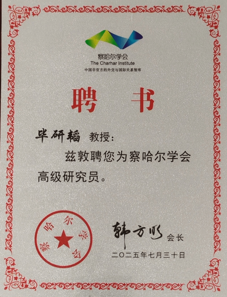 近日,bwin必赢传播学系毕研韬教授受聘为察哈尔学会高级研究员。