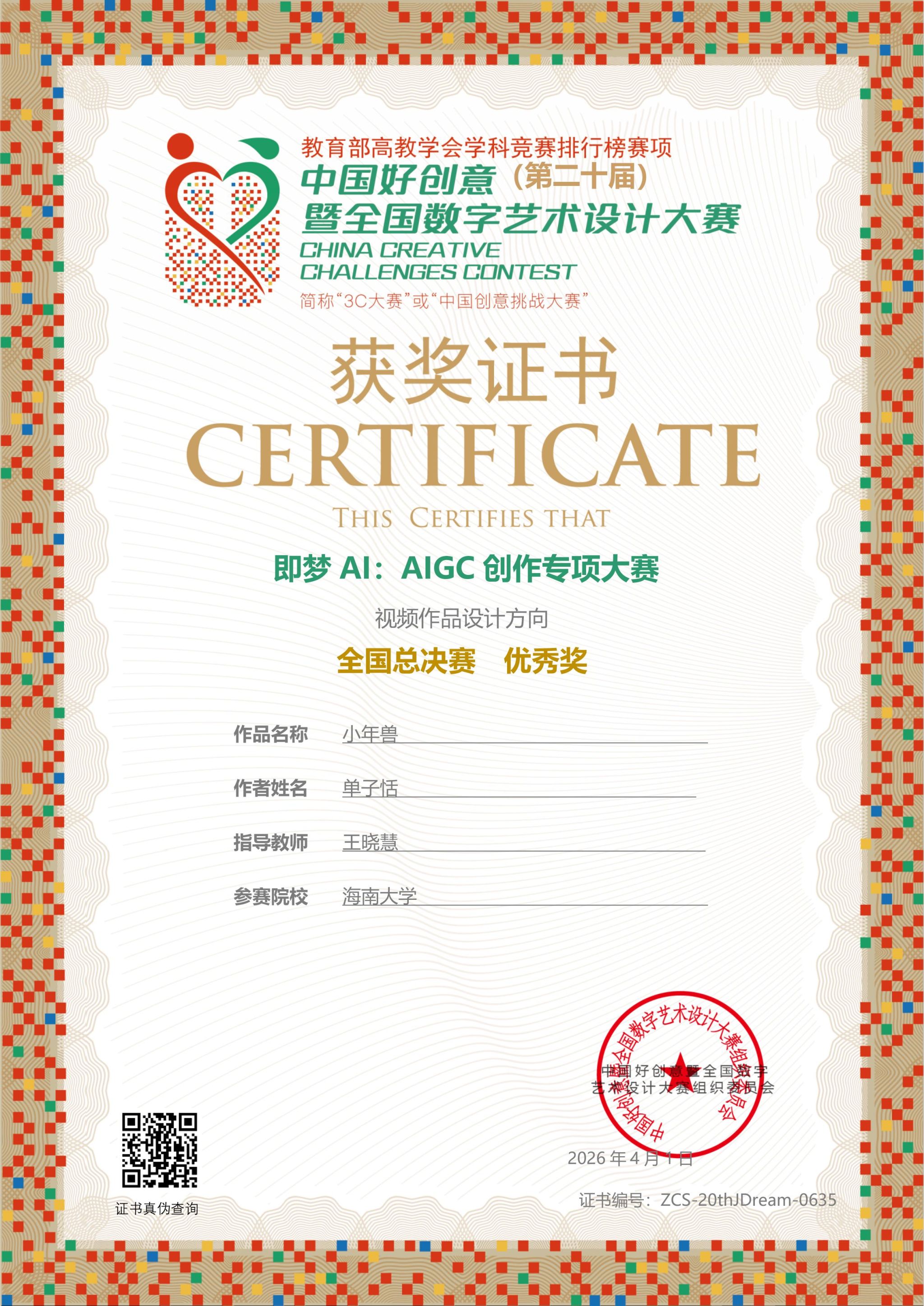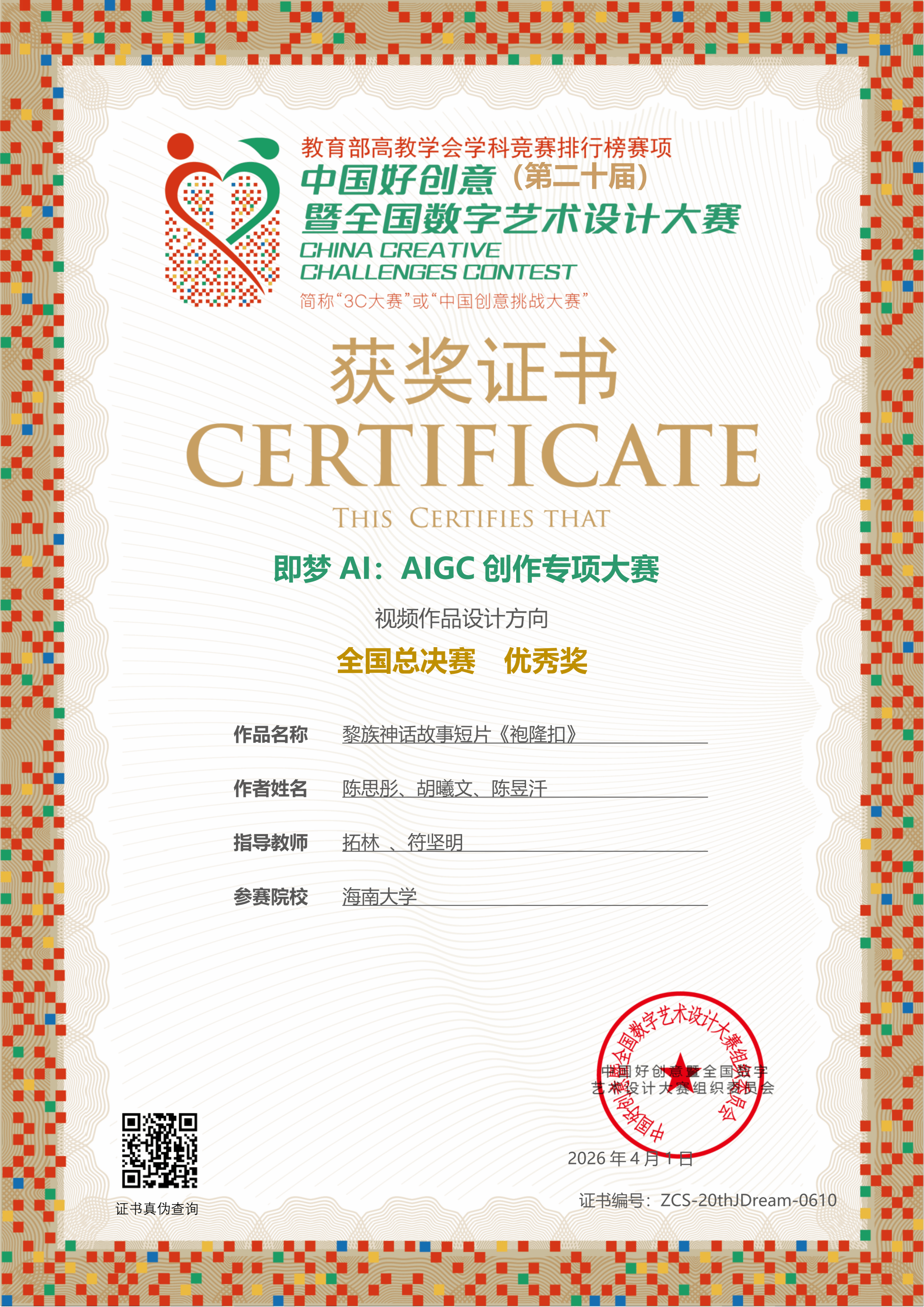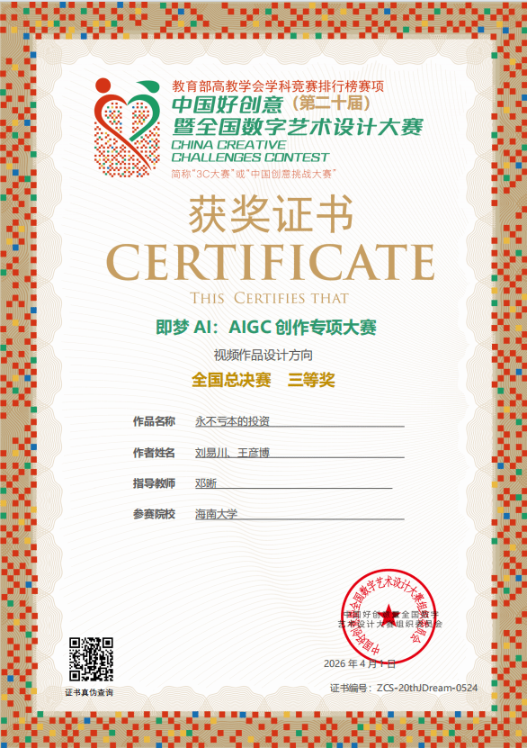 【喜报一】2026年4月1日在中国好创意暨全国数字艺术设计大赛第20届“即梦AI:AIGC创作专项大赛”中,bwin必赢3部作品从4万余件参赛作品中突出重围,荣获国赛三等奖1项、优秀奖2项。