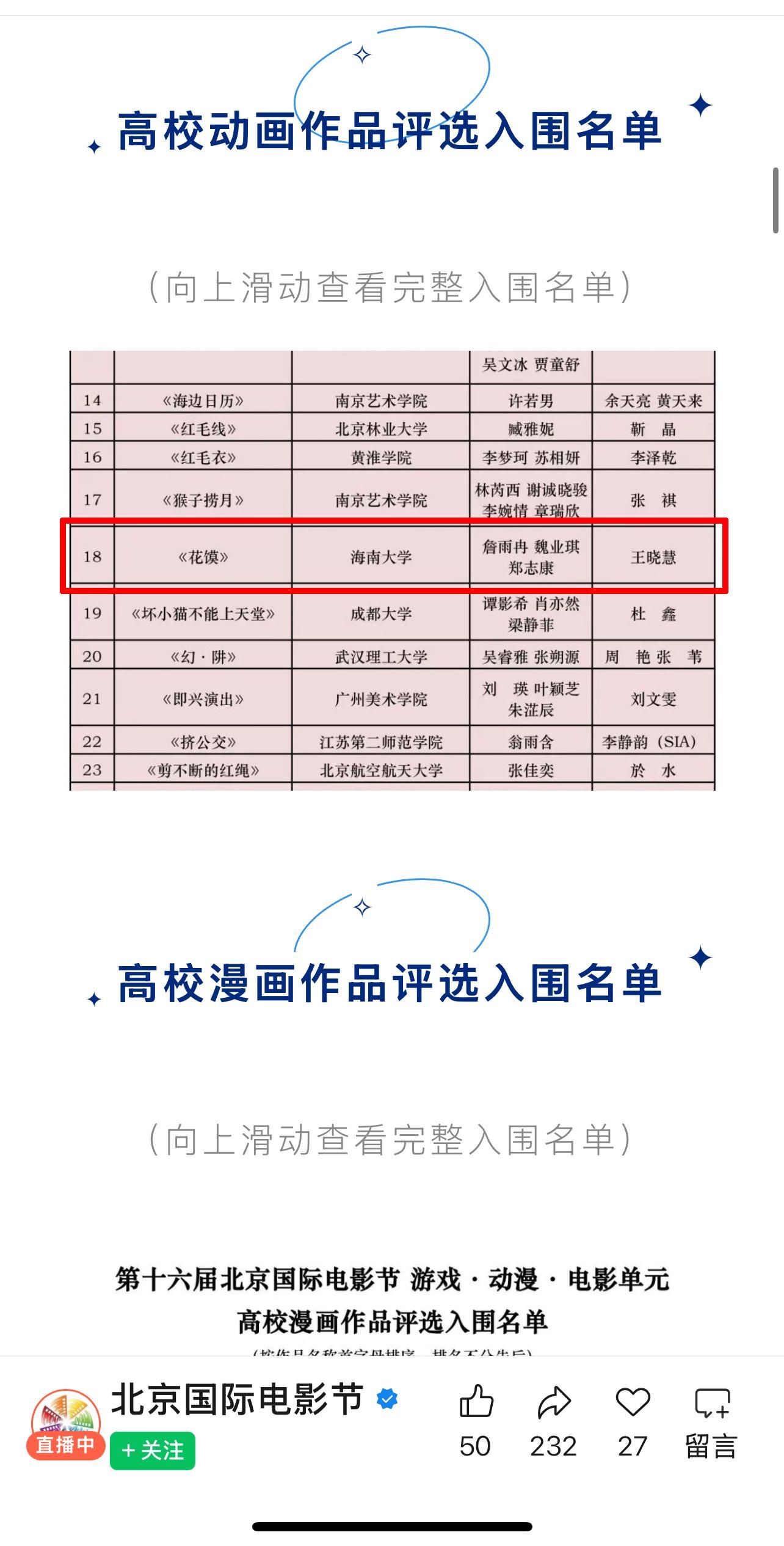 【喜报二】2026年4月14日,第十六届北京国际电影节游戏·动漫·电影单元高校动漫作品评选入围名单揭晓,bwin必赢视觉传达动画数字艺术模块作品《花馍》成功入围。